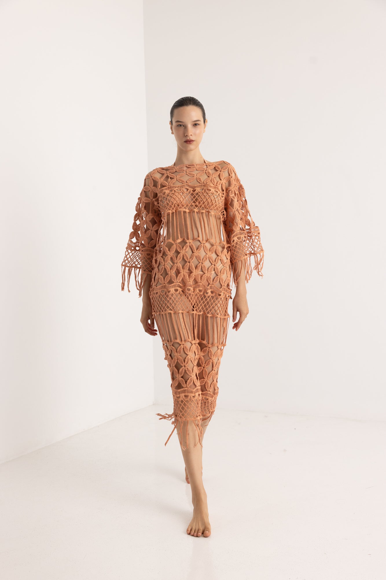 The Astarti dress exudes classic glamour. Cut from 100% cotton gauze with lurex, its flowing shape enhances and flatters the figure. The straps can be adjusted to tie around the neck as a halter or simply as shoulder straps. The back of the dress is open and very elegant. The gold hardware catches the gold lurex and the finished look is sheer glamour.