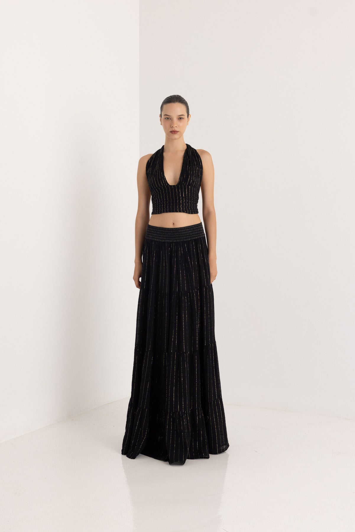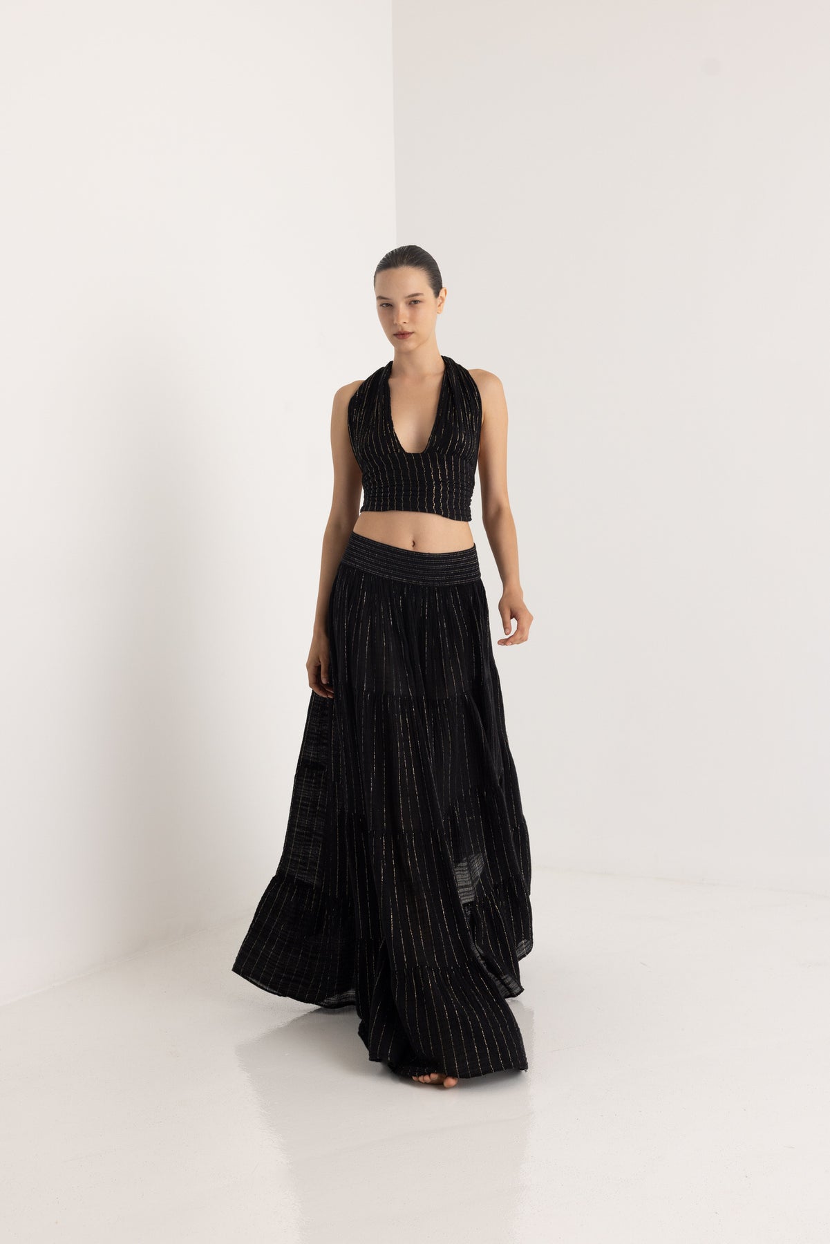 This classic but timeless maxi skirt reflects the summer mood. The Gaby maxi skirt is 4 tiered creating a flared look that will make you want to twirl all day long. Wear it with the Eros or June top and Agatha sunglasses for a perfect summer look.