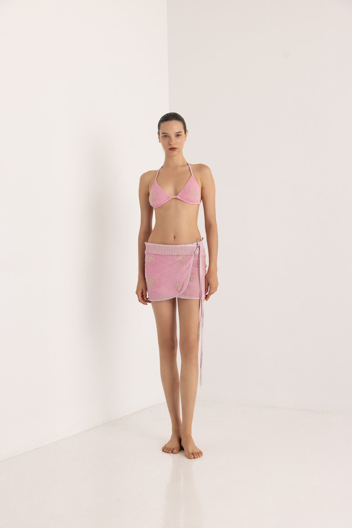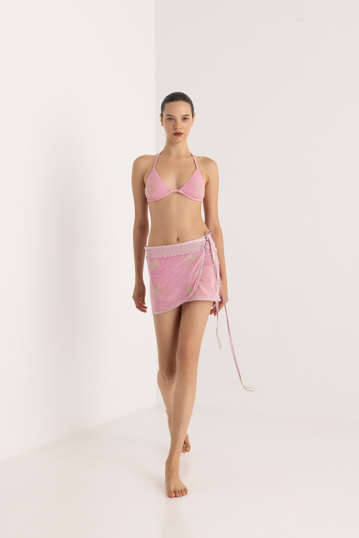 The Naira beaded bikini set is a luxury swimwear choice that exudes elegance and glamour. Combine it with the Laksmi maxi kimono.