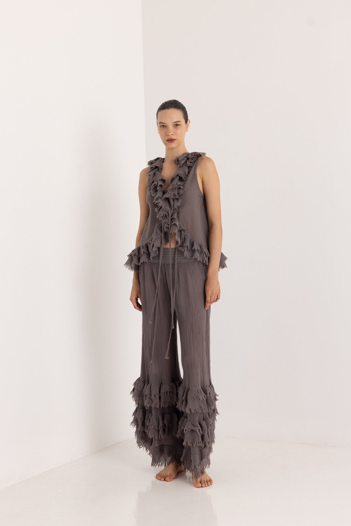 Wide-leg pants made from breathable cotton gauze, designed with a comfortable elastic waistband and fluid movement. The dramatic tiered ruffles and raw frayed trims add texture and a bohemian elegance. Wear them with the Yuki top, Alaska bolero or Arizona vest for a complete look.