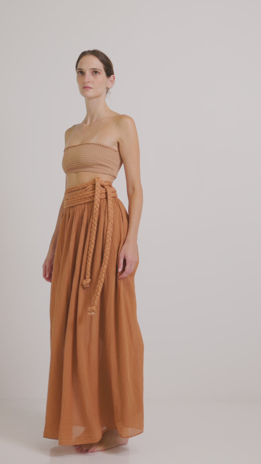 The Calypso maxi skirt with braided belts at the waist is a striking and versatile choice, ideal for boho, romantic and summer looks. The braids at the waist add a special, handmade touch and allow for different ways of tying, adapting the skirt to your style and silhouette. Combine it with the Eros top for a complete summer look!